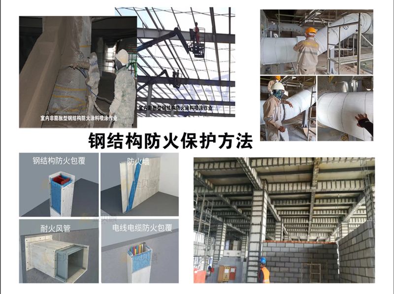 钢结构的防火保护可采用多种措施和方法。主要包括:喷涂(抹涂)防火涂料、包覆防火板、包覆柔性毡状隔热材料、外包混凝土、金属网抹砂浆或砌筑砌体、或者以上这几种方式的复合。从总体上来说,在钢构件表面涂覆防火涂料,形成隔热防火保护层,这种