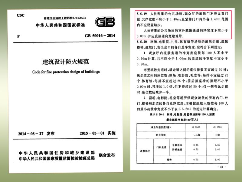 示例1:《建筑防火通用规范》第7.1.4条规定“疏散出口门的净宽度均不应小于0.80m”,依此,《建筑设计防火规范》部分条文中的疏散出口净宽度可由原来的0.90m调整为0.8m(比如公共建筑内疏散门和安全出口、住宅建筑户门和安全出口以及厂房内的疏散门和安全出口等),但对于人员密集的公共场所、观众厅的疏散门,仍应执行《建筑设计防火规范》第5.5.19条规定,其净宽度不应小于1.40m,不得以0.80m净宽度作为这类场所的合格性判定标准。